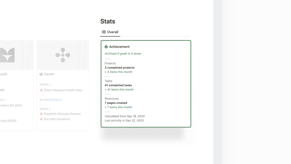 We understand that motivation is key to staying on track. That's why our Notion template includes a built-in achievement system. Track your progress, celebrate your wins, and stay motivated to tackle your goals head-on. Achievements are powerful motivators, and we've harnessed their potential to keep you inspired and driven.